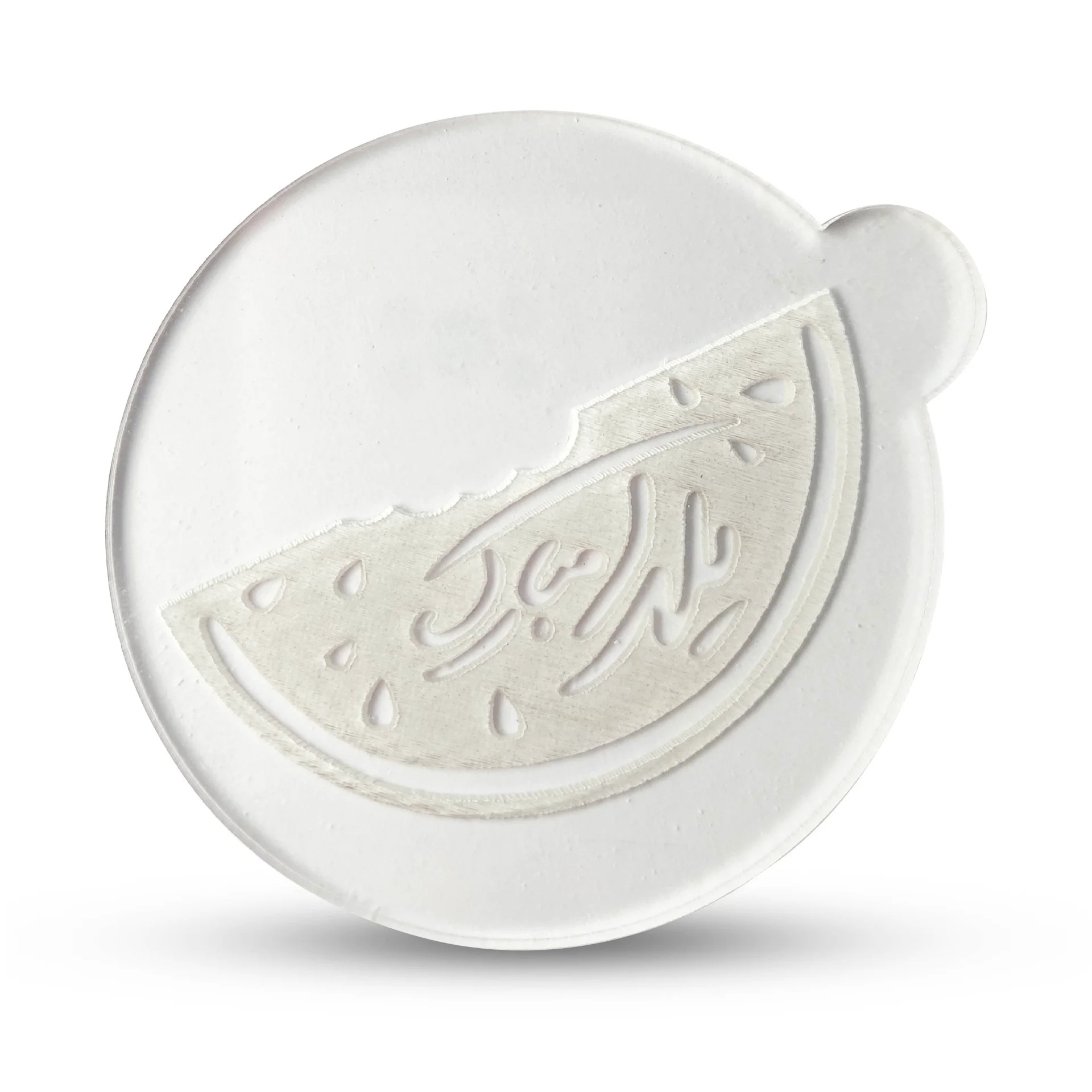 فقط کافیه استامپ رو روی خمیر فشار بدین تا طرح هندوانه با دانه‌های خوراکی و نوشته‌ای چشم‌گیر به‌صورت برجسته شکل بگیره. این طرح می‌تونه هم روی بیسکوییت‌های مخصوص یلدا، هم روی خمیر‌های فوندانت برای تزئین کیک‌ها استفاده بشه و طعمی از سنت و هنر رو در کنار هم به نمایش بذاره.
