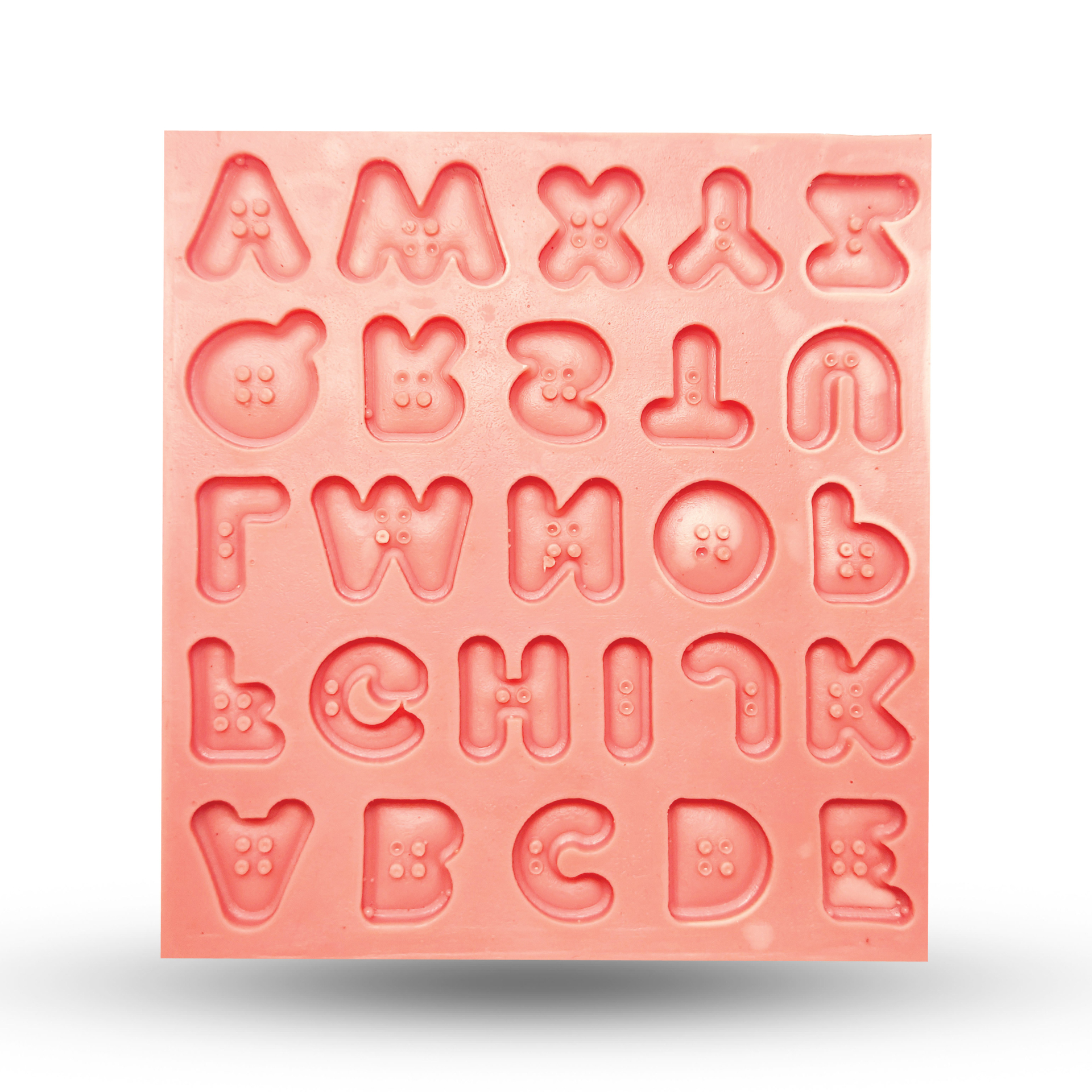 طراحی شیک و منحصر‌به‌فرد – این قالب شامل مجموعه‌ای از حروف که درون دکمه‌های ظریف قرار گرفته‌اند، روی فوندانت، مارزیپان یا خمیر شکلاتی نقش می‌بندد.